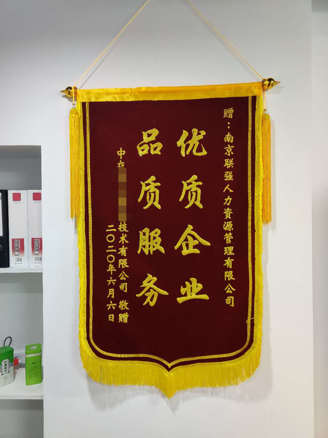 6月6日,南京联强人力资源管理有限公司收到客户赠送的一面“优质企业,品质服务”的锦旗,对其企联二部销售主管-王宇尽职尽责、诚实守信的服务表示了高度赞扬和诚挚感谢。